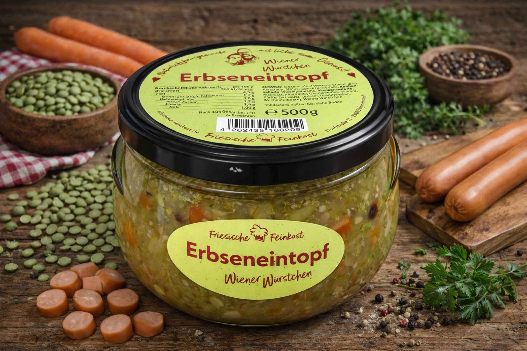 Erbseneintopf (Wasser, grüne Erbsen, Kartoffeln, Möhren, Speckwürfel), Knollensellerie, Wurzelpetersilie, Stangensellerie, Meersalz, Pflanzenöl, Gemüsebrühe, Piment, schwarzer Pfeffer, Lorbeer, Gewürznelken, Wacholderbeeren, Wiener Würstchen