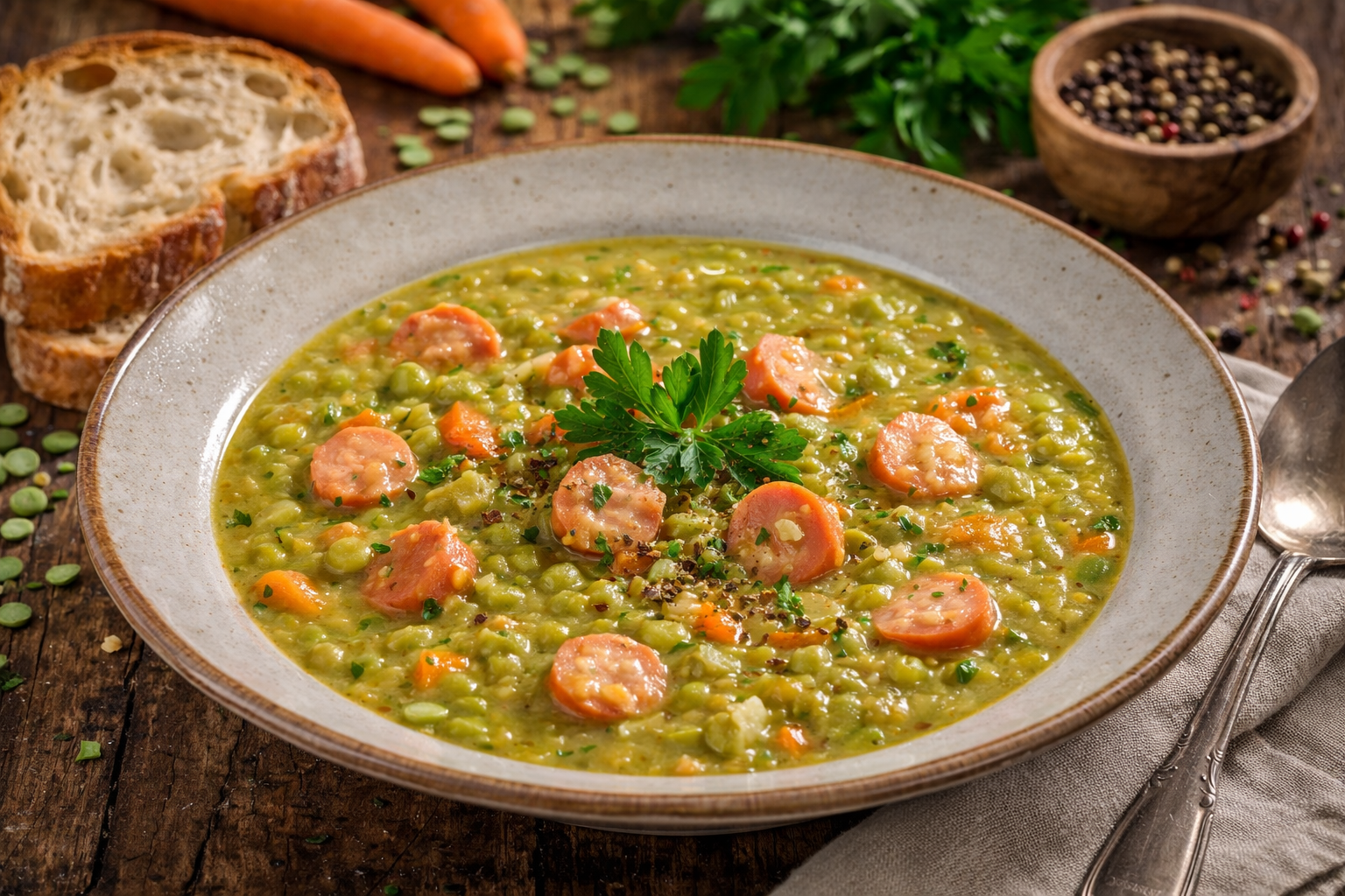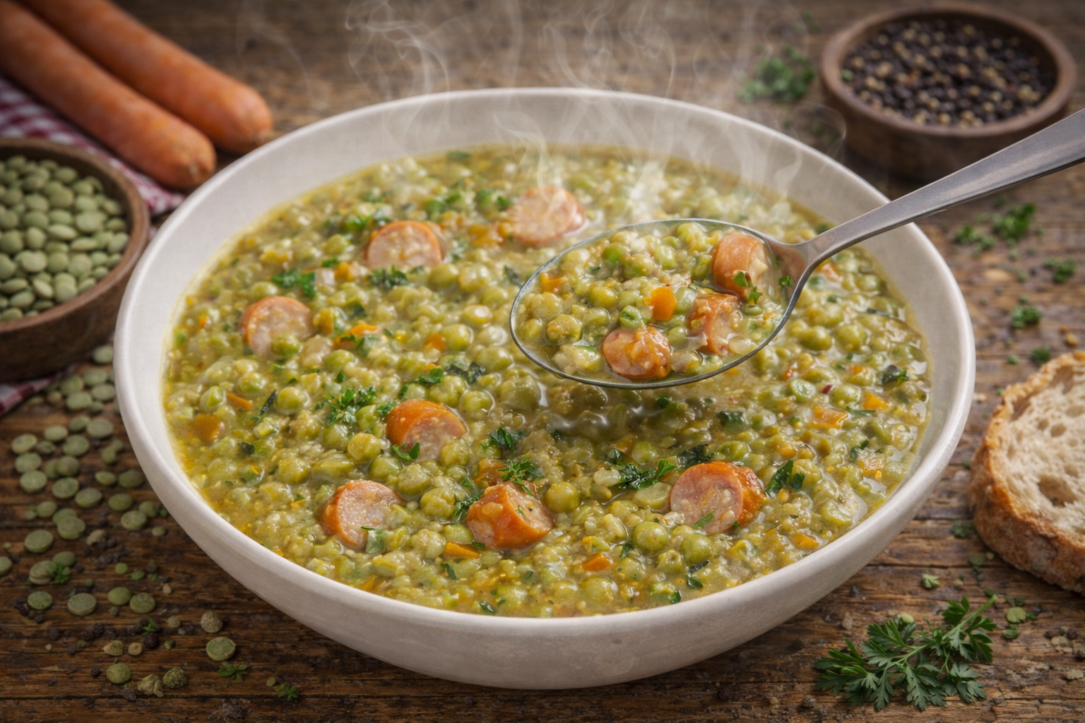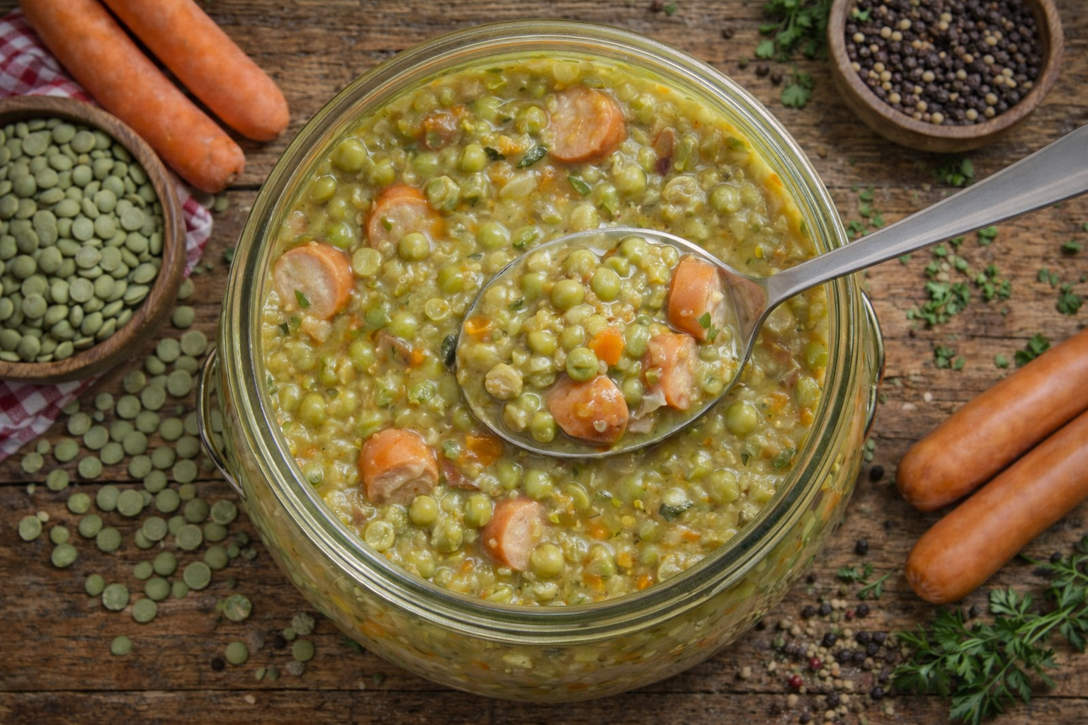 Klassischer Erbseneintopf aus unserer Manufaktur – mit grünen Erbsen, Gemüse und würziger Einlage langsam gekocht. Ein herzhaftes, traditionelles Gericht im Glas für eine schnelle und hochwertige Mahlzeit.