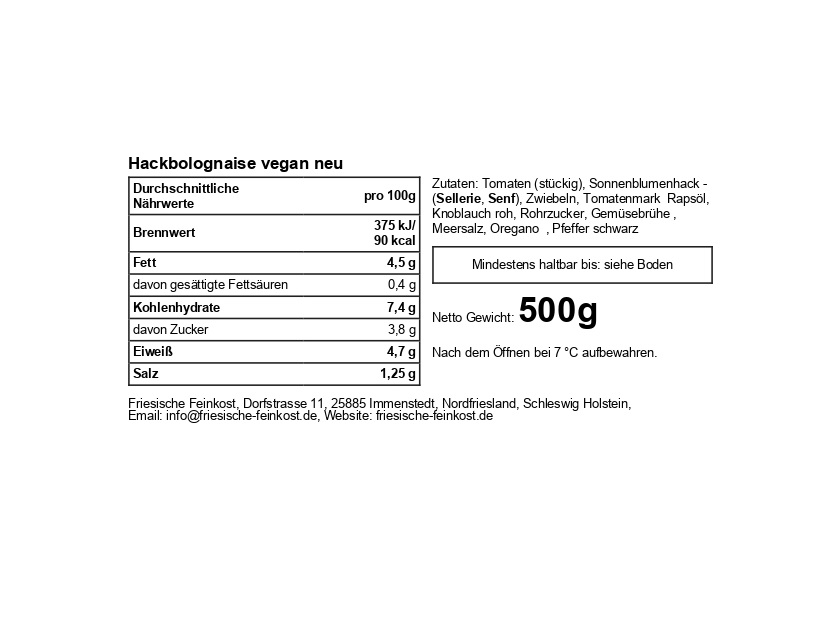 Unsere vegane Hackbolognaise wird aus hochwertigem Sonnenblumenhack hergestellt und langsam gekocht. Fruchtige Tomaten, Zwiebeln und ausgewählte Gewürze sorgen für eine vollmundige Sauce mit guter Struktur – pflanzlich, sättigend und ohne Schnickschnack.