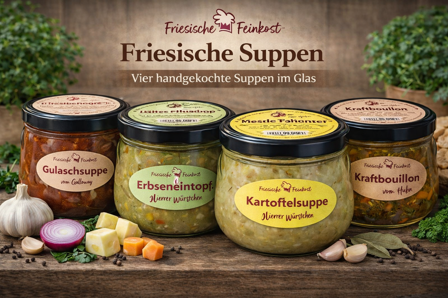 Unsere Suppen Box von Friesische Feinkost vereint vier klassische Hausrezepte aus unserer Feinkostküche.