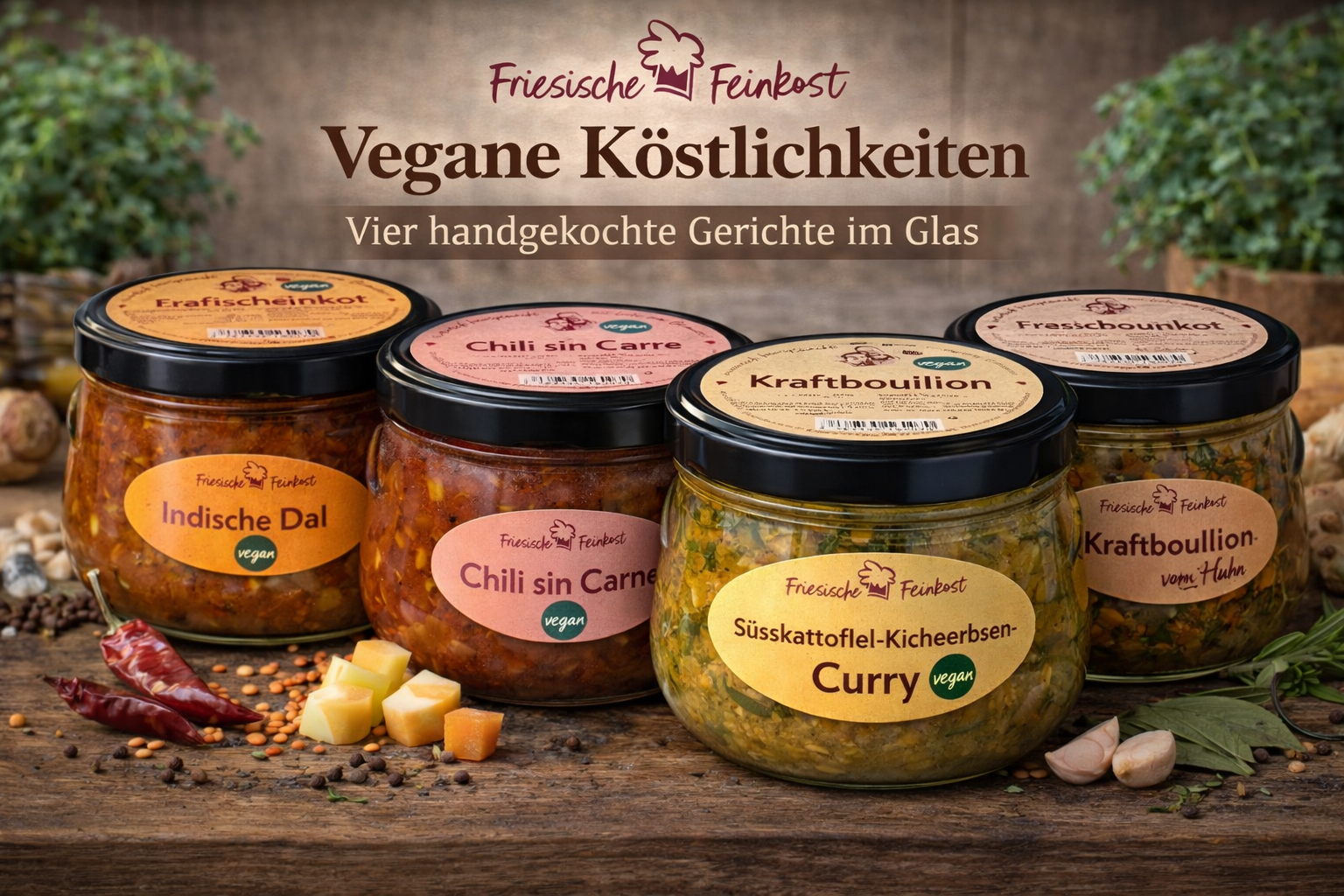 Vier aromatische vegane Gerichte im Glas zeigen, wie vielseitig pflanzliche Küche sein kann. Mit ausgewählten Gewürzen und hochwertigen Zutaten gekocht – vollwertig, sättigend und voller Geschmack.